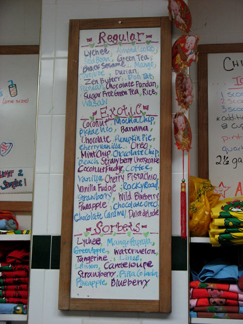 As we perused the dry erase board for an alternative, we could have chosen from among Lychee, Durian, Pandan and Zen Butter (peanut butter ice cream with toasted sesame seeds) listed under “Regular” flavors. Under “Exotic”: Chocolate and Vanilla.