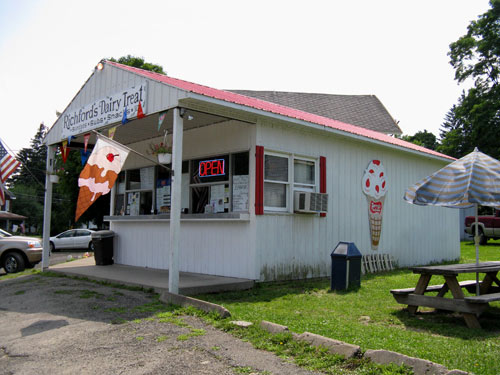Some places are worth a stop, just because you like the looks of them. Richford’s Dairy Treat caught our eye as we made the turn onto Route 79, with its hulking black smoker parked in the front lot, and huge signs advertising BBQ chicken and 24 flavors of soft serve ice cream — mixed to order.