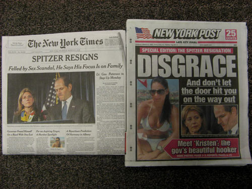 The New York Times broke out the full 12-inch banner headline: “Spitzer Resigns.” The Post, ever classy, added “And don’t let the door hit you on the way out.”