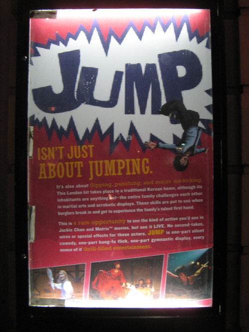 Jump was created by Korea’s Yegam Theatre Company, and spent several years in development before it premiered at the Woolim Cheongdam Theater of Seoul in 2003. Since then, the show has had successful engagements throughout Asia and Europe, earning a Comedy Award at the Edinburgh Fringe Festival in 2006. The 90-minute spectacle began an open-ended run at the Union Square Theater on September 25, opening officially on October 7 before a packed house that included the Jolie-Pitt crew.