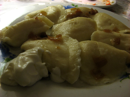 Platter of steamed potato and cheese pierogis with a side dollop of sour cream — so filling, I could only eat a few: