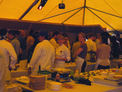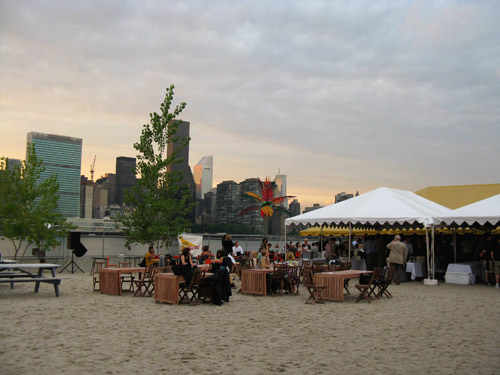 At the Just Food fundraiser at Water Taxi Beach tonight, courtesy of M, who picked up a pair of pricey tickets to the sold out event. Proceeds benefited this non-profit organization whose focus is to develop a sustainable food system in New York City. In addition to fostering opportunities to support local family farms and community gardeners, Just Food partners community-based organizations with regional farmers to advance the growing movement of CSAs — mine among them.