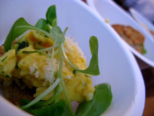 The event, dubbed “Let Us Eat Local“, began with an awards presentation honoring local leaders and farms. M and I hardly heard the announcements, perhaps because we were happily distracted by the ice cream and Long Island winery tables, which the organizers had positioned in the outer tents, farthest from the podium. (Later, Adrienne Young and her band would provide the musical entertainment from the same stage.) Over two dozen restaurants and purveyors were represented here in all — each offering tastes of their wares, emphasizing local, organic ingredients. All presented with biodegradable servingware and utensils, of course.
