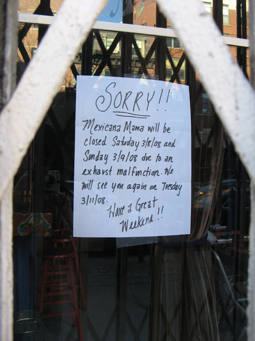 No matter, I can eat at any time. I can also sleep at any time, in just about any place — ambient noise and lack of bed, notwithstanding: an ability honed through sleep-deprived years of riding the subway to and from school. But I digress. When in her old ‘hood, MLF likes to visit Mexicana Mama, so we were all looking forward to settling in for some salsa and margaritas on a lazy Sunday.