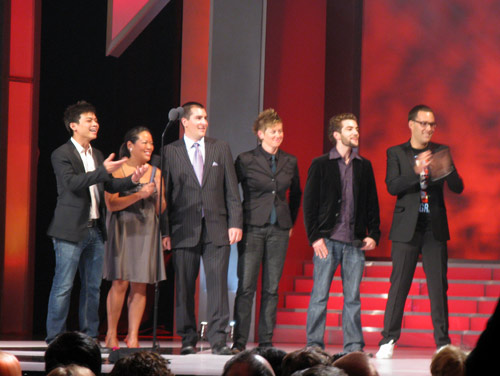 To close out the awards ceremony, there was a charity fashion show (benefiting UNICEF) featuring “celebrities” strutting outfits designed for them by Project Runway alums: Candace Bushnell and season 2 designer Daniel Franco, Holly Kiser and season 4 finalist Chris March, Kathy Griffin and season 2 designer Nick Verreos, Katrina Smirnoff and season 3 finalist and “Fan Favorite” Michael Knight, Kat Von D and season 4 finalist Sweet P, Niki Taylor and season 3 finalist Laura Bennett, Nikki Blonsky and season 3 designer Malan Breton, Rebecca Budig and season 3 designer Alison Kelly.