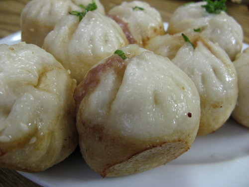 Fried Tiny Buns (Sheng Jian Bao) — similar to the soup-filled Pork Steamed Buns (Xiao Long Bao), a tray of which we also ordered, but with a doughy, pan-fried outer skin: