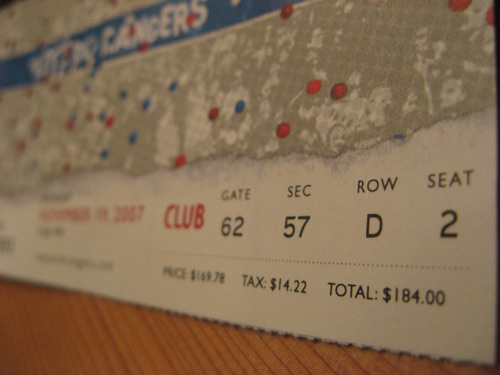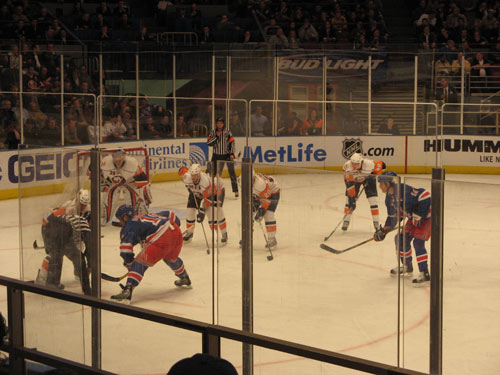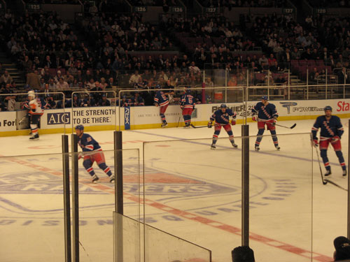 Check out the rest of the game photos on flickr, though unlike at the Knicks game a couple of weeks ago, there was a notable lack of cheerleading support on the ice. Sorry, boys, the Rangers City Skaters disbanded after former captain, Courtney Prince, brought a 2004 sexual harassment lawsuit against the club. Is it something in the air at the Garden?