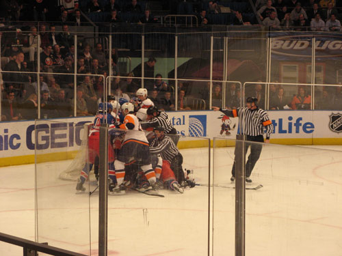 And what would a hockey game be without a brawl? This pile-on ensued after Isles’ goalie Rick DiPietro punched Rangers bad boy Sean Avery in the head. Tsk, tsk.