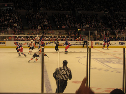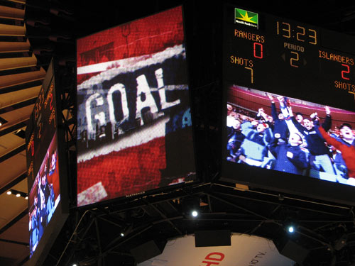 Singer-actress Hilary Duff was in attendance that night – though we didn’t see her — cheering on her boyfriend Islanders forward Mike Comrie. In between periods, I tried — unsuccessfully — to get a text message posted up on the JumboTron scoreboard. Apparently my proposed missive deviated too far from the usual “Go Rangers!” “Islanders rule!” and “Dear Sharon, I Love You Forever!! Will You Marry Me? Streety Bird,” which aroused some suspicion among my companions. Were the MSG censors hard at work this night? Or was it just that the 18,200 fans inside the arena generated too many messages for all to be displayed? We’ll never know.