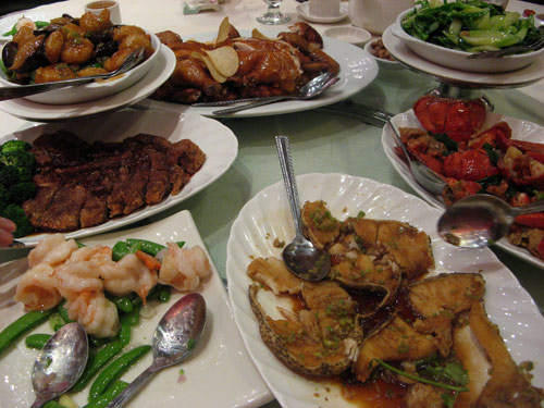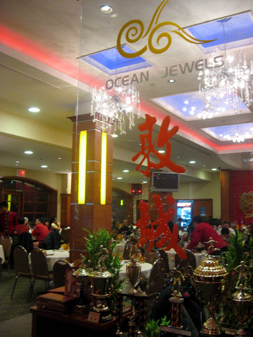 I never eat better in Chinese restaurants than when my parents or their Hong Kong compatriots take command of the ordering. I can’t even replicate the meals on my own if I try; half the time, those same dishes don’t seem to appear anywhere on the standard English menu to which I’m most often relegated. This cold, wet evening we all met at Ocean Jewels Seafood Restaurant, located across 39th Avenue from the Flushing Mall. (One day I’ll have to devote an entire post to that kitsch and foodie paradise.)