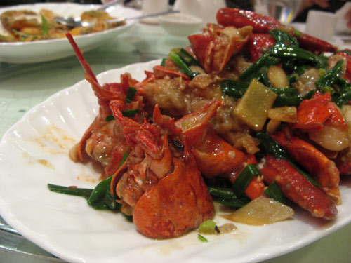 I noticed that Ocean Jewels has a lotus-leaf-wrapped version of the sticky rice/Dungeness crab dish that I love of late, but tonight, our crustacean of choice was the Lobster with Ginger and Scallions: