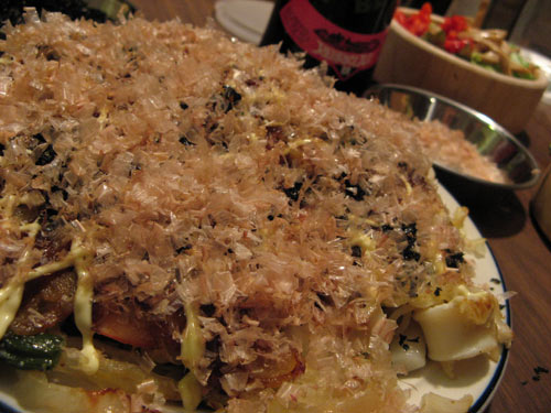 We finished the pancake with squeeze-bottled grids of mayonnaise and tonkatsu sauce, plus generous handfuls of bonito flakes which danced eerily in the heat. Filling and delicious!
