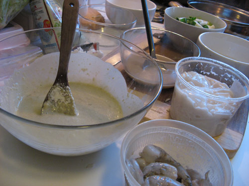 JL laid out all the ingredients and explained the process of making the base, adding copious amounts of sliced cabbage and toppings, and flipping the entire pancake to allow the different layers to hit the hot pan at various intervals. Our Hiroshima-style version of the dish included a layer of pan-fried noodles (Kansai [Osaka]-style omits this), sliced bacon, shrimp and squid, rice cakes (which melted down to gooey goodness), and chopped onions. Lots of fun, actually, and once we began assembling in earnest, the mad flurry of activity sent clouds of smoke wafting throughout the kitchen.