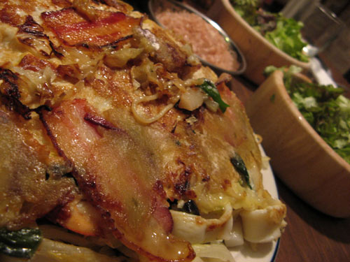 Okonomiyaki is a Japanese dish, whose name (according to Wikipedia) is derived from the Japanese words “okonomi,” meaning “what you want”, and “yaki” meaning “grilled” or “cooked.” I’ve seen the dish described as Japanese savory pancake, or Japanese pizza — understandable, if not perfect, reference points: the popular Japanese street food is prepared in a pan or on a griddle by integrating flour batter with layers of cabbage and assorted toppings of seafood, meat and vegetables.