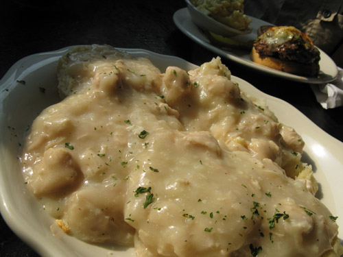 And we’re so glad we did! The Gathering turned out to be a charming diner with a stooled formica-top counter, friendly service and a chalkboard on which were handwritten the homemade pie offerings — always a good sign. And on the menu: Chicken n’ Biscuits — made daily from scratch: