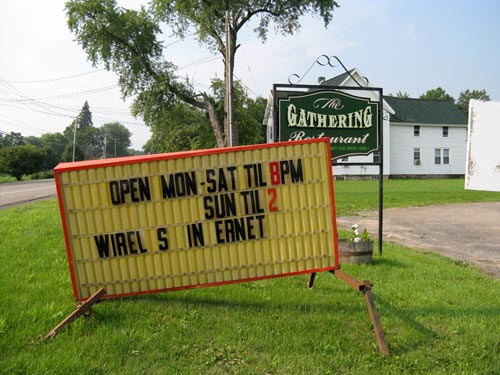 All of which brought us eventually to The Gathering in Moravia, which we all agreed was a name less suited for a restaurant than for an M. Night Shyamalan film. We were slightly reassured by the handful of cars in the parking lot — a veritable crowd in this sparsely populated region — but slightly perplexed by the presence of a drive-thru. But we pulled in anyway, deciding to take our chances. (Plus, did I mention we were starving?)