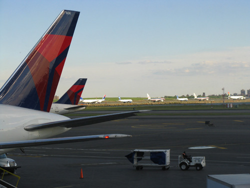 I read about DelayCast — a new site which has built mathematical models of the U.S. air transportation system to predict on-time and cancellation probabilities — in The Times last month. Earlier today, I plugged in my arrival and departure airports, one hour flight time window and airline; DelayCast predicted a 44% chance of leaving as scheduled. That did not bode well. And when I arrived at JFK after a 90-minute traffic-clogged ride from my apartment, I discovered that holiday congestion is not limited to the Van Wyck or to TSA security checkpoints.