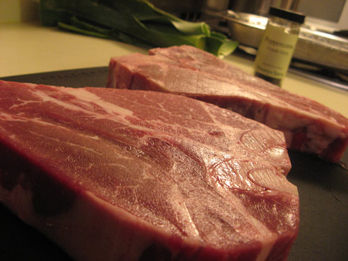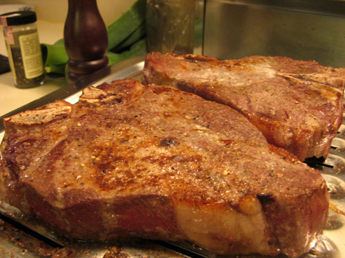 Like tonight, where we were gathered at Casa B for a sumptuous dinner of porterhouse steaks. Check out these thick, beautiful slabs from Omaha Steaks:
