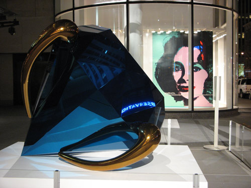 It’s not every day that one comes across a giant blue diamond on the street. Specifically, it was Jeff Koons’ eight by seven foot sculpture, “Blue Diamond” (2005) sitting outside of Christie’s Auction house. Part of the artist’s famed “Celebration” series, which he began in 1994, the blue “diamond” is in fact made of polished steel and chromium, and is one of a series of five; Koons’ red, pink and green diamonds are in private hands, while a yellow version is currently in production. The eye-catching sculpture was displayed in advance of Christie’s Post-War And Contemporary Art auction on November 13 where it was sold to Gagosian Gallery for $11.8 million. Despite more than doubling Koons’ previous sale record of $5.6 million, the amount still came in somewhat under pre-sale expectations, which had ranged from $12 million to $20 million. (To put this in perspective, last month an actual flawless 6.04 carat blue diamond became the most expensive gemstone in the world [per carat] when it was sold at a Sotheby’s auction in Hong Kong for $8.3 million.)