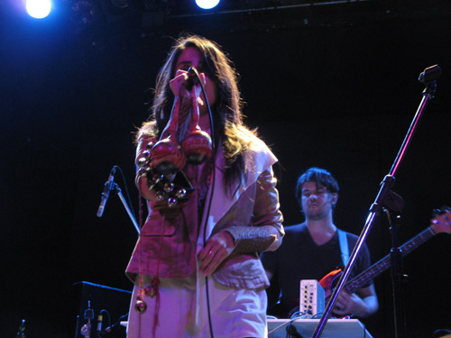 After drinks in the lounge, we headed upstairs to stake out our strategic spots near the stage. First up: California-based duo Blank Blue. The band is a collaboration between producer Elvin Estela (a.k.a. Nobody) and vocalist Niki Randa, who first met in 2001 while working together at independent Long Beach record store Fingerprints Music. The adorably pigtailed Randa – over whom the guy next to me swooned, “Oh, I’m in lo-o-o-ove!” — celebrated her 28th birthday that night, with a Whole Foods cake presented to her by her bandmates.