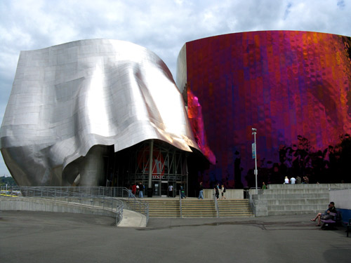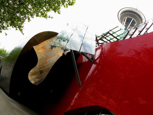 JM among others had recommended a visit to the Frank O. Gehry-designed Experience Music Project|Science Fiction Museum and Hall of Fame. CF and MT had visited this garish, multi-colored building a few years ago, back before the SFM replaced the “Funk Blast” wing with its much-missed ride. (Incidentally, I thought I was only one for whom the connection between rock and science fiction was lost, but apparently not.)
