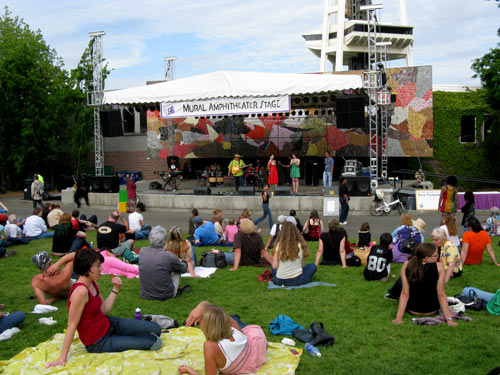 Outside the museum, the annual Northwest Folklife Festival was taking place. Impromptu performances, the waft of incense, stalls selling hemp goods and holistic medicines… if I had been asked to guess at which of the two area festivals there would be a shoot-out this weekend, this would not have been my choice.