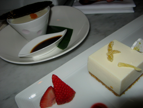 The Tofu Cheese Cake, topped with candied ginger, was wonderfully airy with a hint of tanginess, but I loved Kyotofu’s “Signature Sweet Tofu,” served with a shallow boat of kuromitsu black sugar syrup, candied apricot and a crispy black sesame tuile. The silken texture was reminiscent of the Chinese doufu fa, but creamier, with just the right amount of sweetness. Ed Levine called the dessert “strangely beguiling.”