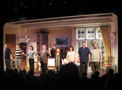 This is the first of Leigh’s works — film or theatre– to deal exclusively with his Jewish background. The story concerns a well-to-do, intellectual Jewish family in the Northern London suburb of Cricklewood, and the domestic trauma that ensues when their brooding, unemployed, university-educated son becomes religiously observant. The rest of the family is decidedly secular: although several members have spent time on Israeli kibbutzes, and all of them casually toss Yiddish words into conversation, they eat bacon and do not attend synagogue; their “Jewishness” seems mostly reflected by their close reading of The Guardian‘s coverage on the Gaza disengagement, bewailing the loss of their Zionist ideals, and loudly shouting during family gatherings. (That last is a stereotype that’s been reinforced endlessly on American sitcoms such as Will & Grace and Frasier. I know: I’ve watched the late night syndicated episodes more times than I care to admit.) When the son starts sporting a kippah (yarmulke) and skulking out into the patio for morning prayers, his parents are at a loss over how to react. (“It’s like having a Muslim in the house… or a martian,” balks the father; the mother, in the meantime, frets over what her son will be able to eat.) In addition, there are the usual family conflicts: sibling rivalries, an estranged aunt (who makes a sudden, unexpected appearance in the second half) and an argumentative grandfather.